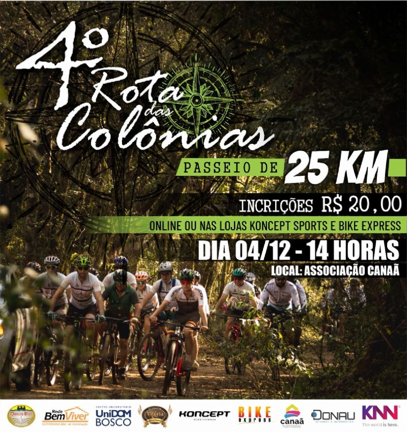 Estão abertas as inscrições para o 4⁰ passeio Rota das Colônias, que irá ajudar as crianças da Associação Canaã. O passeio será super organizado como nas edições anteriores e irá passar pelas lindas estradas rurais da Colônia Entre Rios. Será no dia 04/12 (sábado) com percurso bem sinalizado, carro de apoio, fotógrafos, além de aquela hidratação top após o pedal! Chama todo mundo e vem! Só lembrando da obrigatoriedade do capacete para sua segurança!